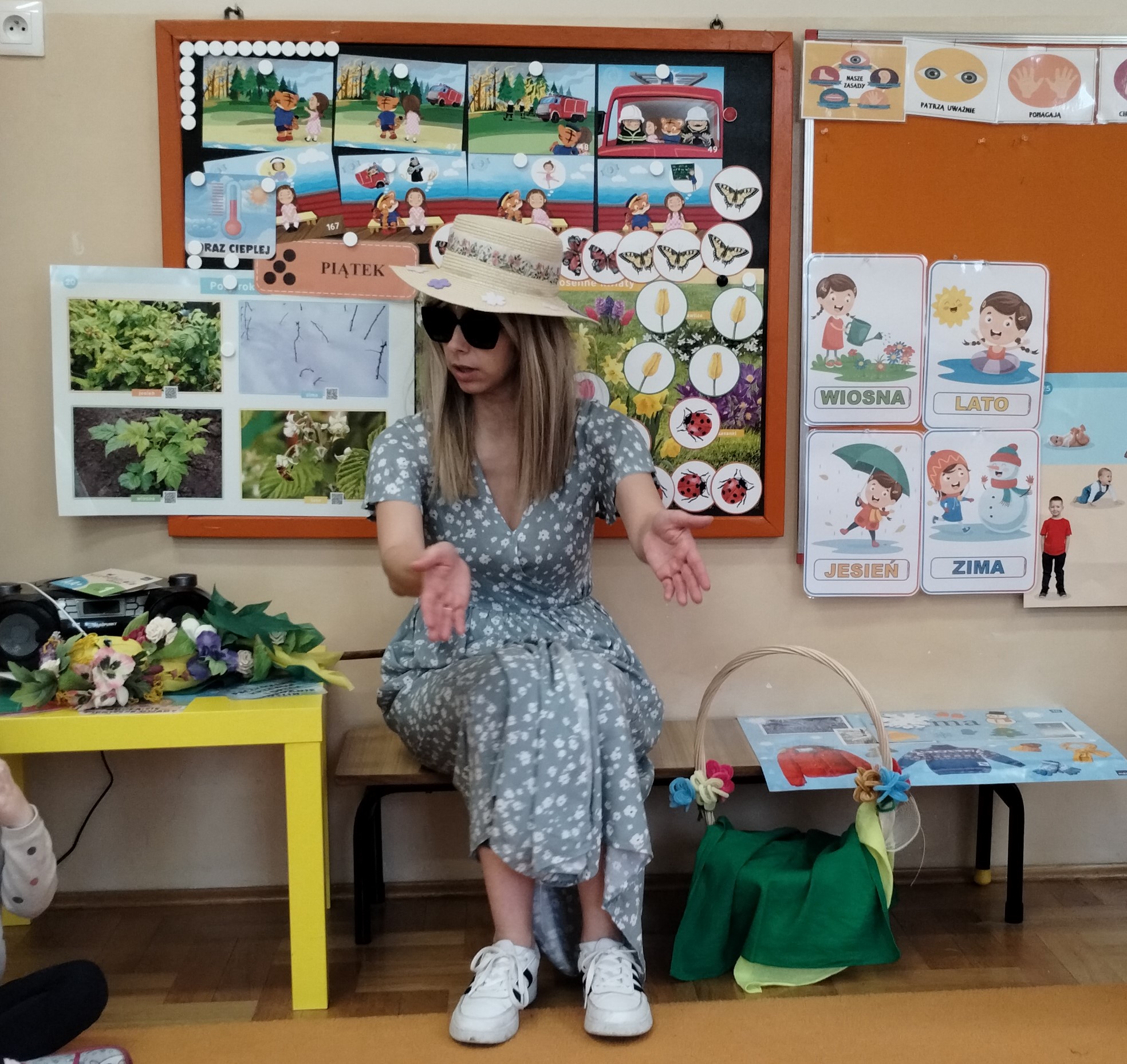 To jednak nie koniec atrakcji. Nasze przedszkole odwiedził wyjątkowy gość — Pani Wiosna. W kwiatowym stroju, z koszem pełnym kwiatów i uśmiechem na twarzy, wprowadziła dzieci w świat budzącej się do życia przyrody. Przedszkolaki wspólnie z Panią Wiosną śpiewały piosenki, a także rozmawiały o pierwszych oznakach wiosny i zmianach zachodzących w przyrodzie.