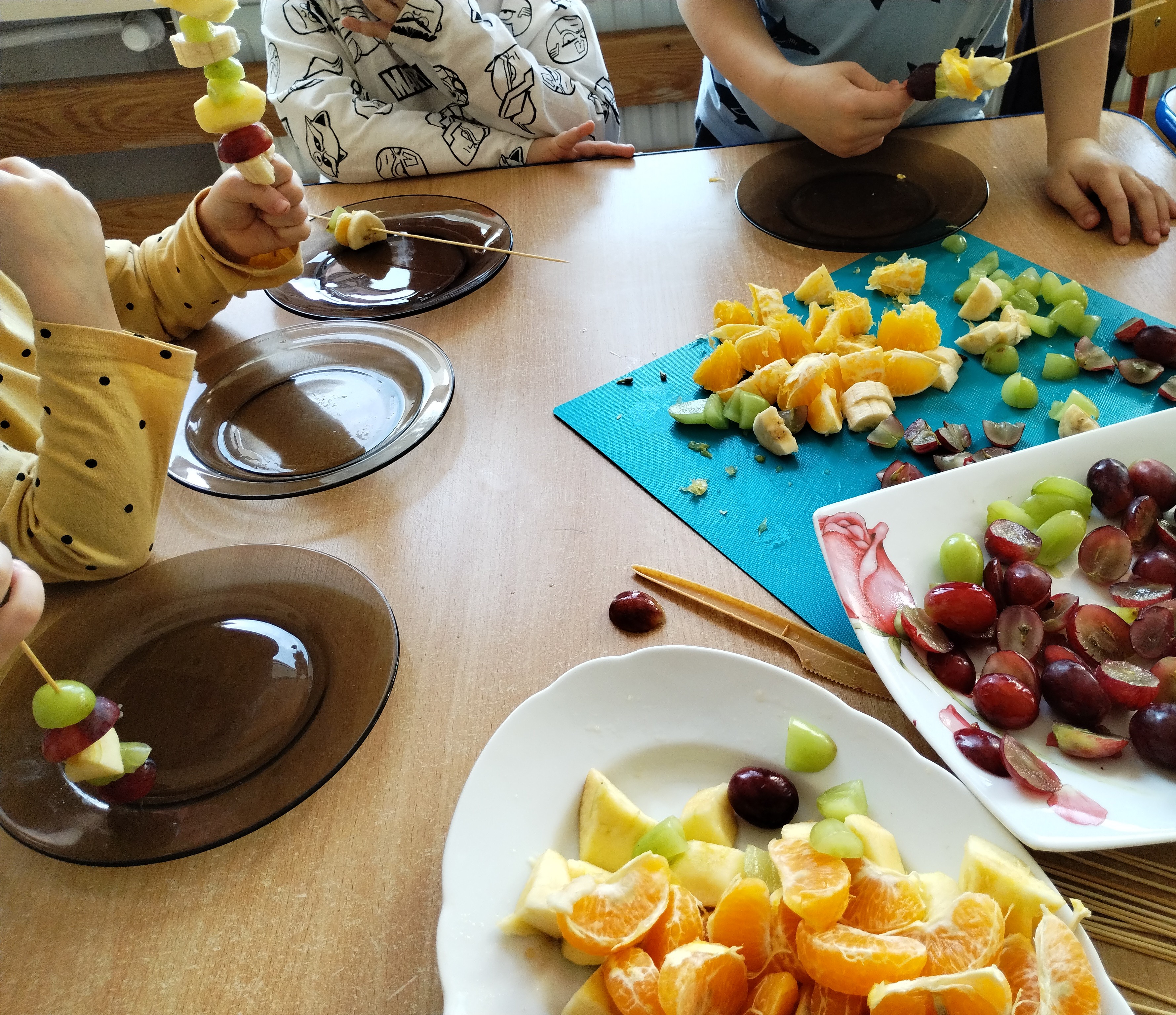 Dzieci rozpoznawały i nazywały owoce po wyglądzie, zapachu i smaku, przypomniały sobie dlaczego warto jeść owoce każdego dnia, samodzielnie kroiły miękkie owoce, a także komponowały kolorowe szaszłyki według własnego pomysłu - pod czujnym okiem nauczycieli.