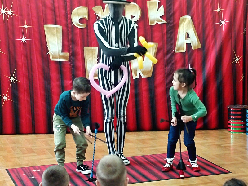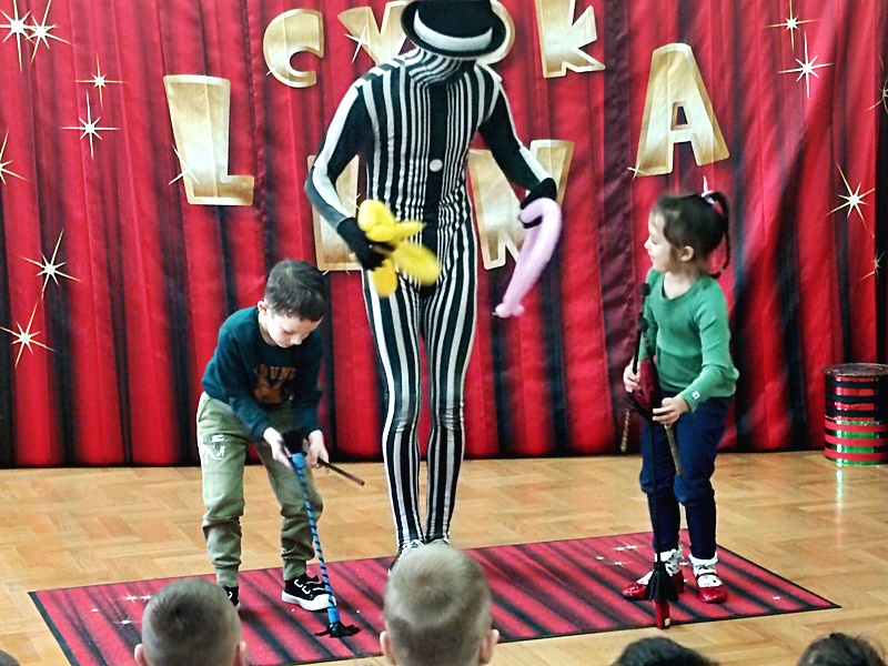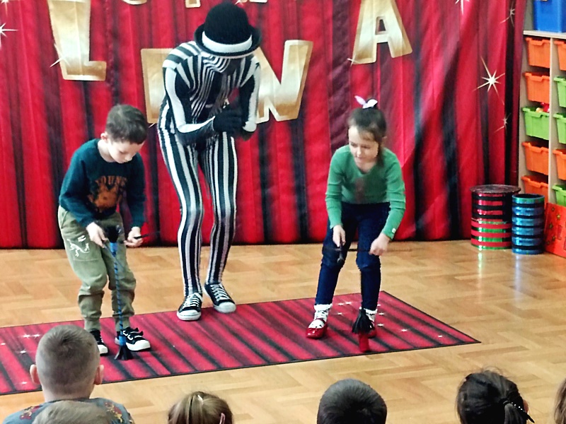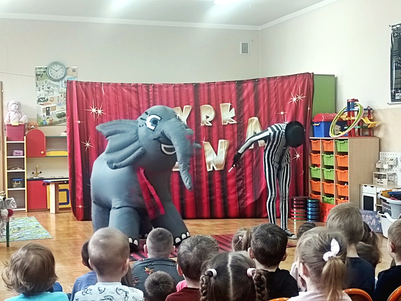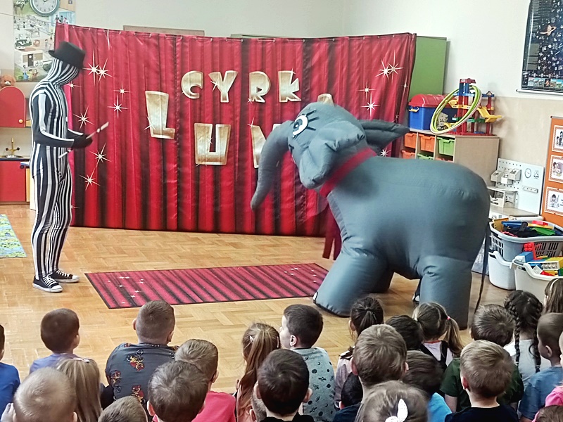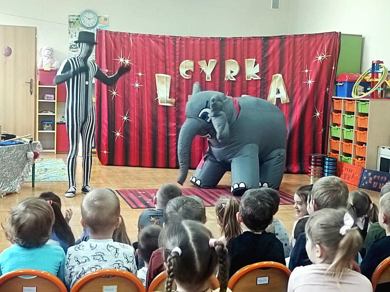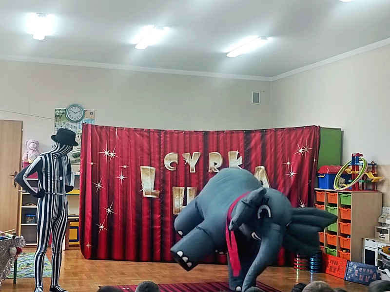 Dnia 16.01.2023 r. przedszkolaki obejrzały występy grupy artystów cyrkowych „LUNA”. Na początku zaprezentował się słonik Jumbo, który merdał ogonem , uszami i tańczył. Następnie odbył się pokaz iluzji , akrobacji, zabawy z klaunem.