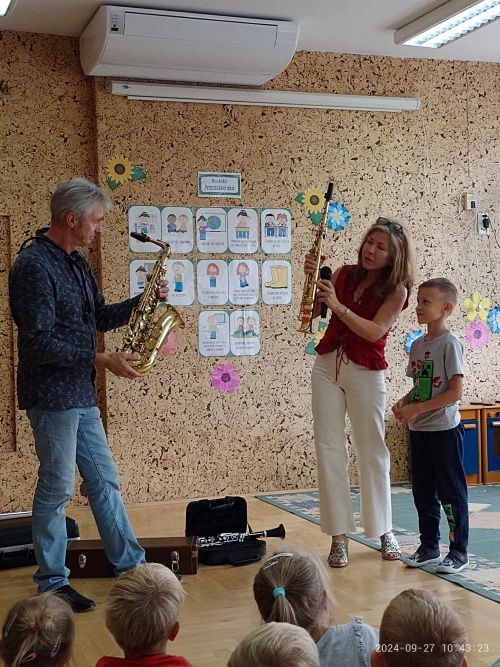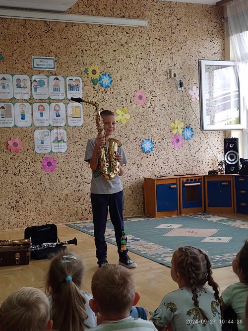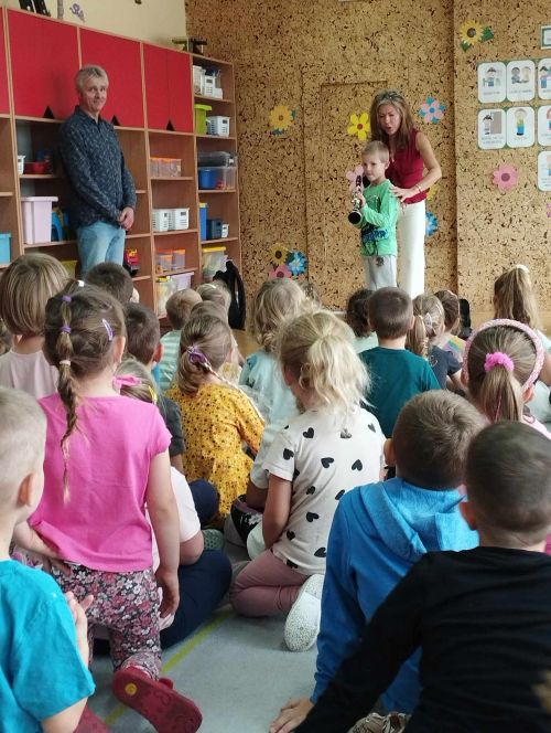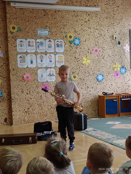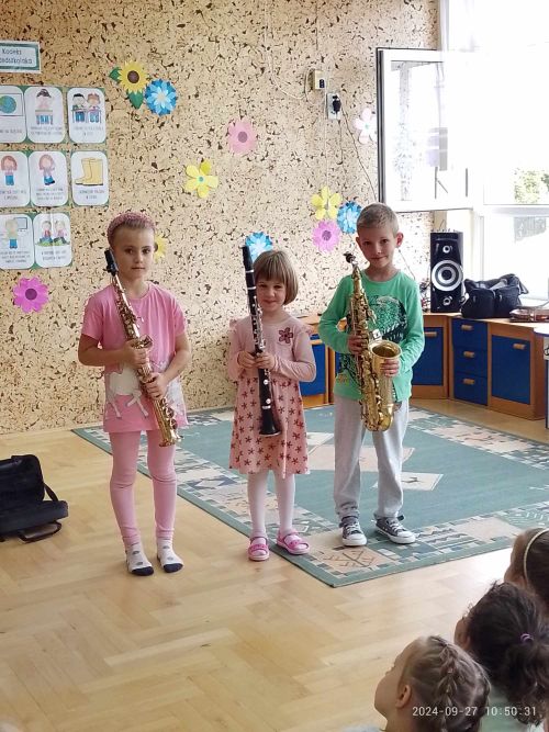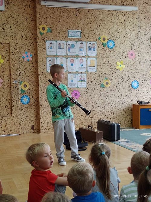 Dzieci: poznały rodzinę klarnetów, odgadywały zagadki muzyczne oraz rozpoznawały i nazywały dźwięki prezentowanych instrumentów.