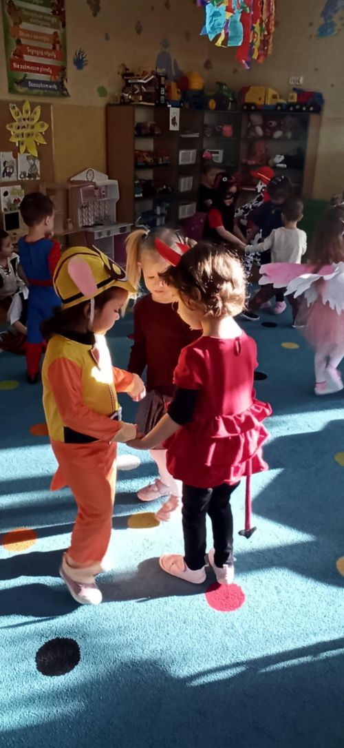 Już od rana, w naszym przedszkolu pojawiły się wesołe postacie z bajek: wróżki, królewny, piraci, policjanci...i wiele innych. Kolorowy wystrój sal i skoczna muzyka zachęcały dzieci do wspólnych zabaw. Były również konkursy i słodki poczęstunek - następny bal: już za rok !!!