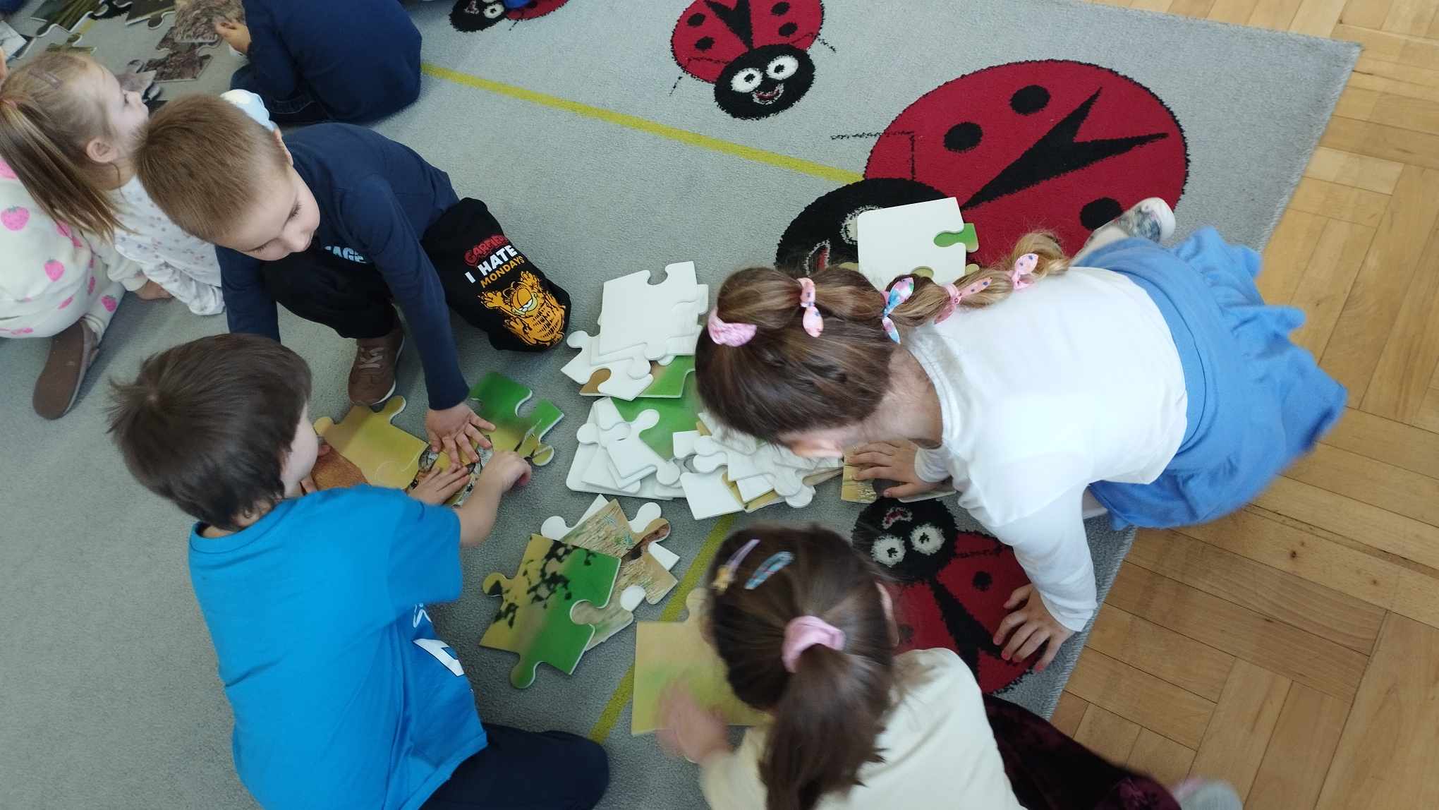 Dzieci poznały prace leśnika. Dużo dowiedziały się na temat zwierząt żyjących w środowisku leśnym oraz zasad ochrony przyrody. Uczestniczyły w zabawach dydaktycznych, w grupach układały puzzle, było też minikoło fortuny z zagadkami.