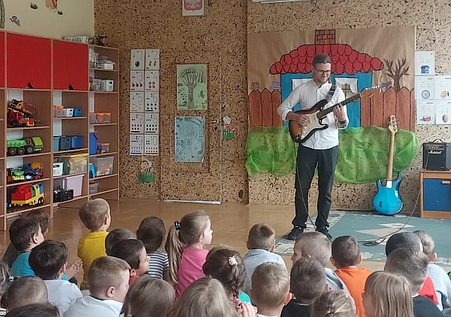 Występy naszych gości wzbudziły ogromny entuzjazm wśród przedszkolaków. Dzieci nie tylko słuchały muzyki, ale również uczyły się podstawowych rytmów i melodii, co sprawiło im wiele radości. Nie zabrakło również śmiałków, którzy odważyli się wystąpić na scenie i zagrać na gitarze pod czujnym okiem pani muzyki.