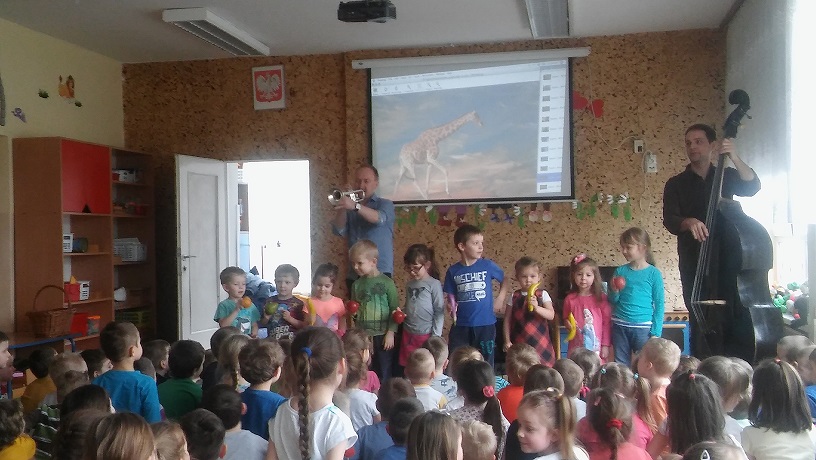 Dnia 16 marca w naszym przedszkolu odbył się koncert muzyczny "Kontrabas i trąbka". Muzycy zabrali wszystkich słuchaczy w podróż do dalekiej Afryki. Dzieci poznały muzykę i popularne instrumenty na tym kontynencie.
