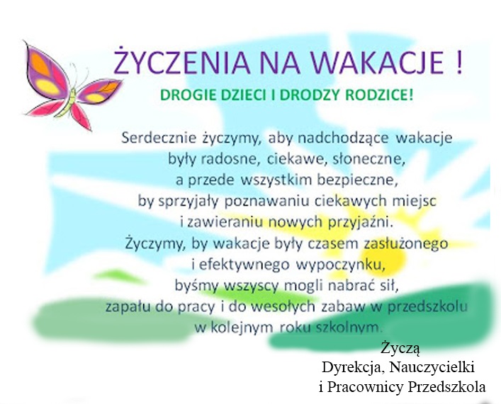 Życzymy, aby te wakacje były zasłużonym czasem bezpiecznego odpoczynku, bogatych wrażeń, wspaniałych przyjaźni, poznawania nowych miejsc i zdobywania życiowych doświadczeń.