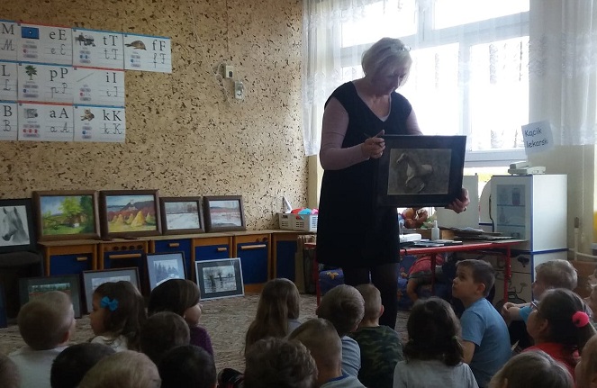 W poniedziałek 11 marca odwiedziła nas pani Anna Butryn - malarka. Zaprezentowała dzieciom swoje obrazy wykonane różną techniką - szkic ołówkiem, piórkiem, węglem, obrazy malowane farbami olejnymi i akwarelowymi.
