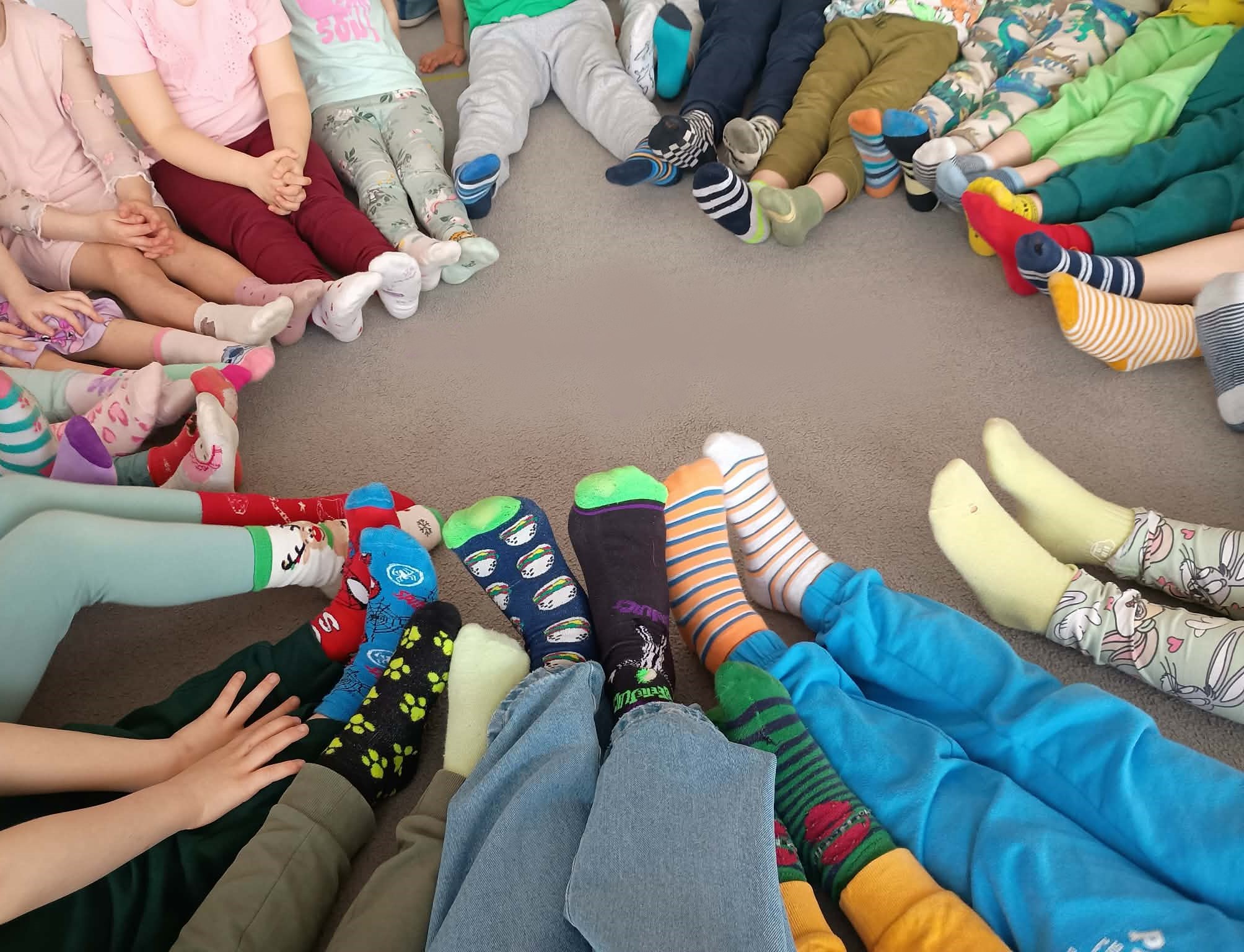 W naszym przedszkolu Pierwszy Dzień Wiosny upłynął w wyjątkowo radosnej i kolorowej atmosferze. Świętowaliśmy Dzień Kolorowej Skarpetki, który jest symbolem akceptacji, różnorodności i solidarności z osobami z zespołem Downa. Tego dnia dzieci i nauczyciele przyszli w barwnych skarpetkach nie do pary, pokazując, że każdy z nas jest wyjątkowy i ważny. Rozmawialiśmy o tym, jak pięknie różnimy się od siebie i jak wiele możemy się od siebie nauczyć.