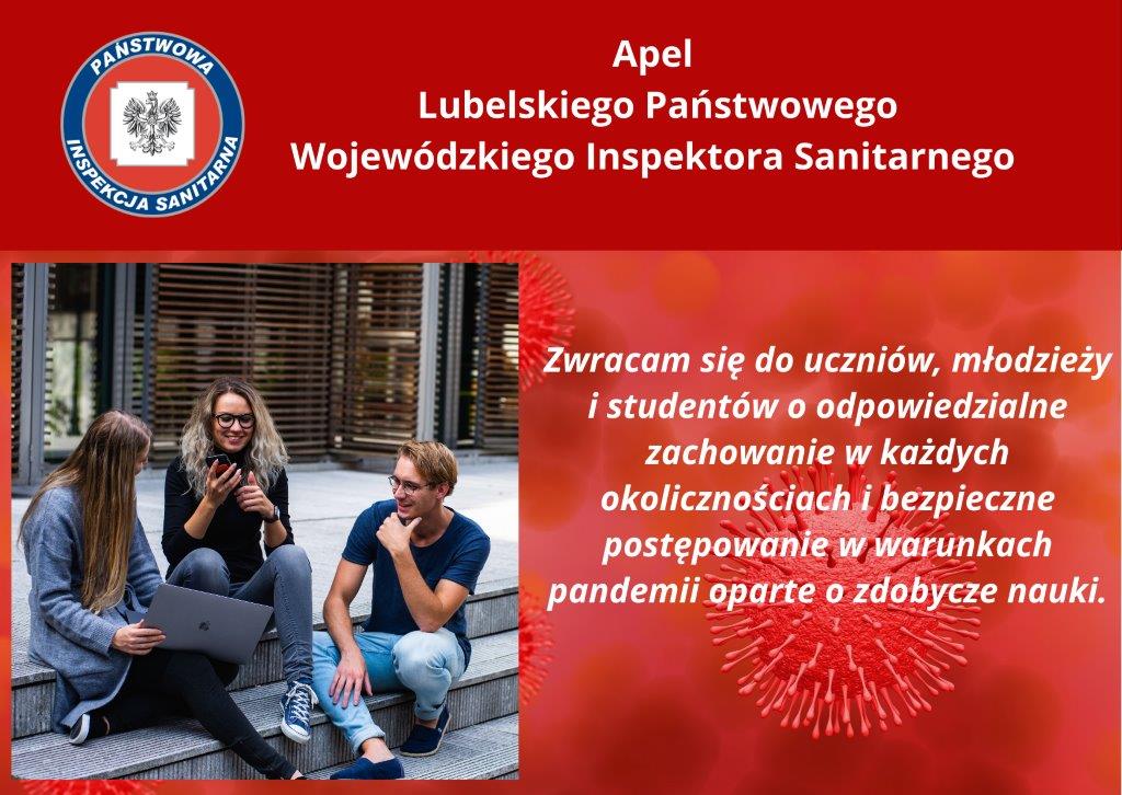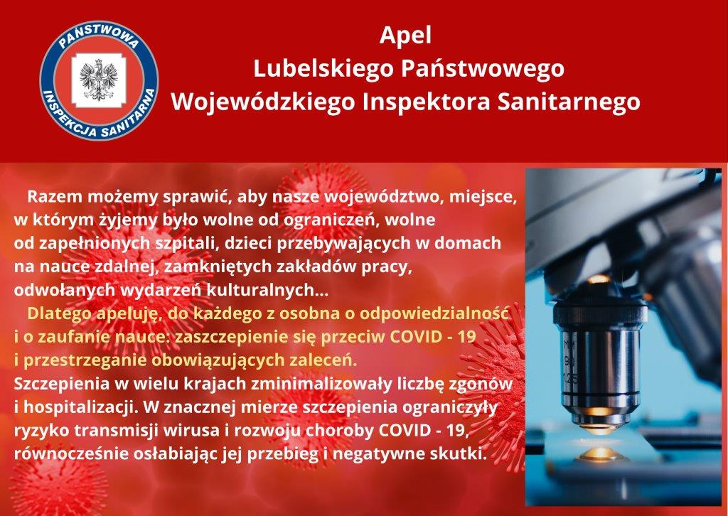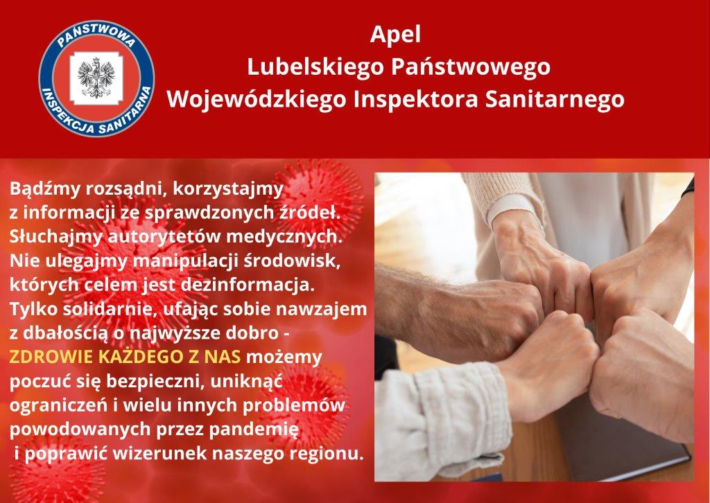 Apel Lubelskiego Państwowego Wojewódzkiego Inspektora SanitarnegoOpublikowano: 27 październik 2021 | Super User | Drukuj | Odsłony: 1459Zadbajmy o nasz region, przerwijmy łańcuch zakażeń! Apel w formacie PDF Poprzedni artykuł Następny artykuł