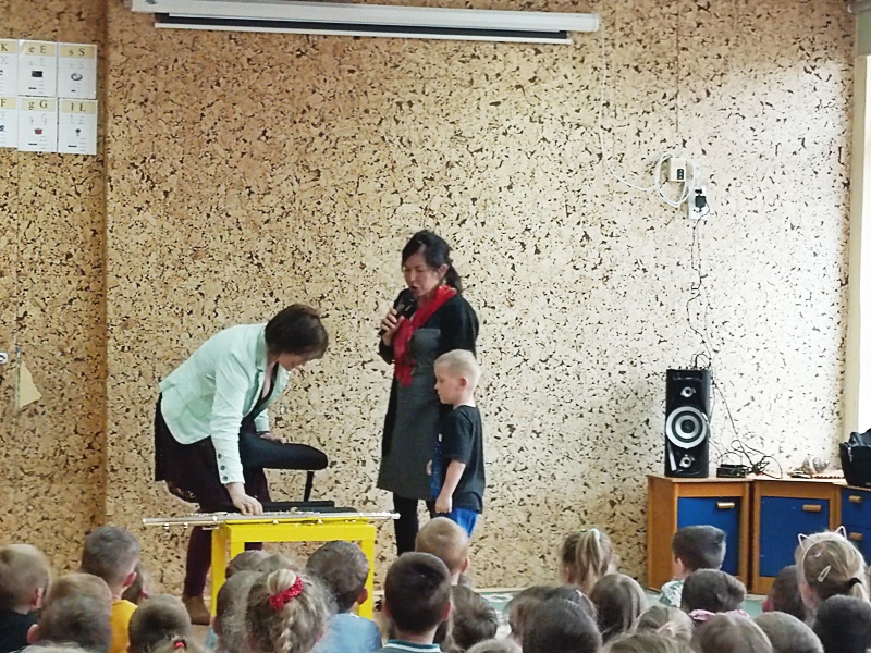Pani Muzyczka pokazała dzieciom z jakich części jest on zbudowany oraz jak różne dźwięki można z niego wydobywać.