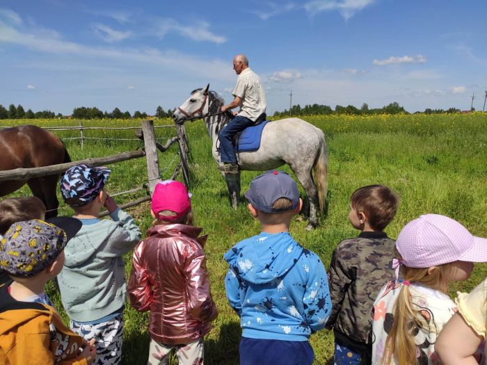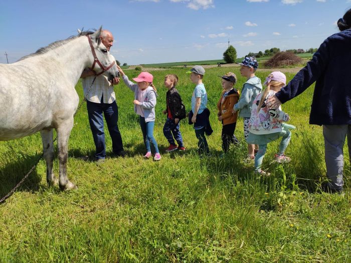 W dniu dzisiejszym, dzieci z grupy VI i VII wybrały się na spacer - na łąkę i podziwiały trzy wspaniałe konie. Dziadek naszego przedszkolaka (właściciel koni) opowiedział dzieciom wiele ciekawych informacji na temat tych sympatycznych zwierząt. Ponadto dzieci mogły pogłaskać konia i obejrzeć pokaz "jazdy w siodle". Pełna emocji i wspanialych wrażeń wycieczka zakończyła się wspólnym zdjęciem. SERDECZNIE DZIĘKUJEMY :)