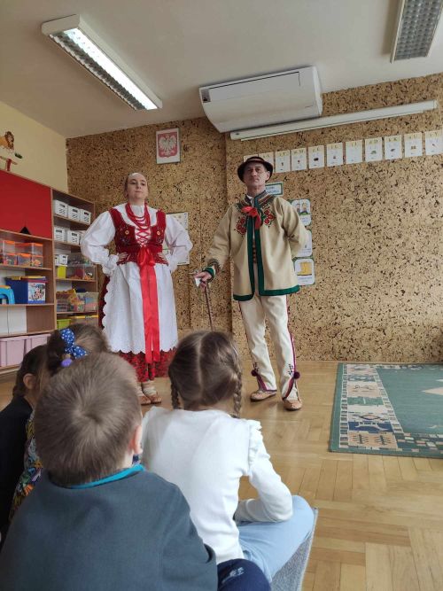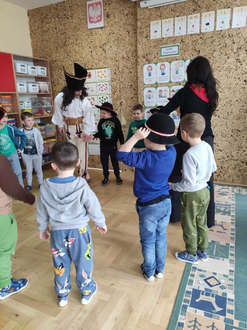 Dziś - "Pani Muzyczka" zaprosiła dzieci w nasze piękne góry. Przedszkolaki poznały góralskie stroje z Beskidu Żywieckiego i Podhala. Starały się również zrozumieć góralską gwarę i poznały historię rozbójnika - Janosika. Na koniec, dzieci odtańczyły zbójnickiego.