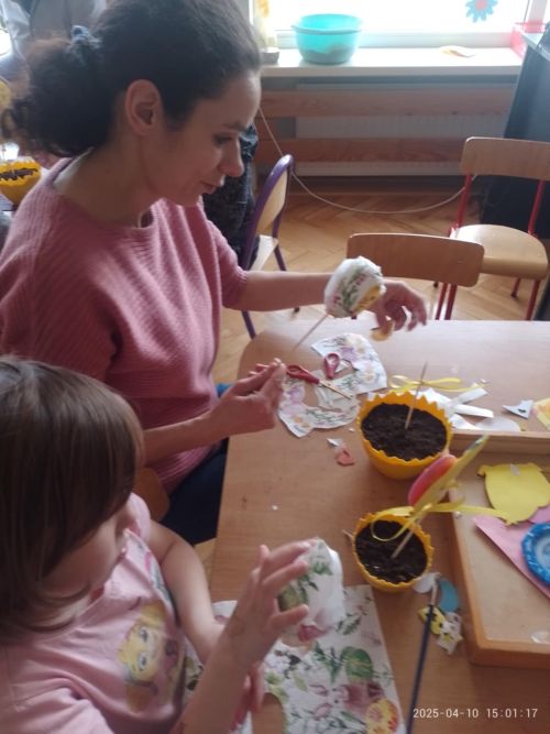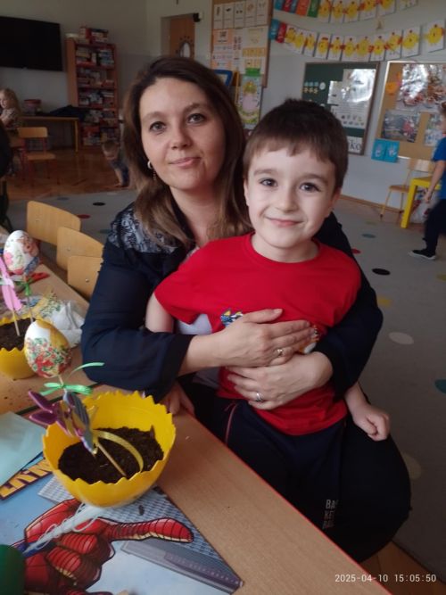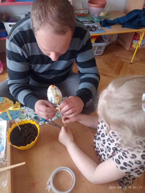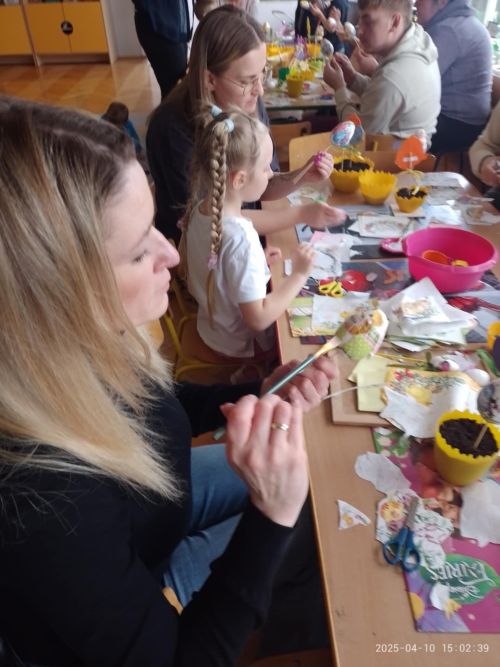 Przed nami radosny czas Świąt Wielkanocnych. Nasze przedszkolaki poprzez różne metody i formy poznają tradycje i symbole wielkanocne. W dniu 10 kwietnia 2025 roku w grupie VI zorganizowano warsztaty wielkanocne z udziałem dzieci i rodziców. Po wspólnych zabawach z wielkanocnym zajączkiem wszyscy zebrani z wielkim zaangażowaniem, zapałem i weną twórczą wykonali ozdoby. Każdy wysiał do doniczki- skorupki owies,a następnie dzieci wyklejały ozdobę - zajączka lub kurczaka. Rodzice pomagali również w wyklejaniu jajka kolorowymi elementami metodą decoupage.Stroiki będą piękną ozdobą wielkanocnego stołu. Współpraca z rodzicami to bardzo ważny element działalności przedszkola.