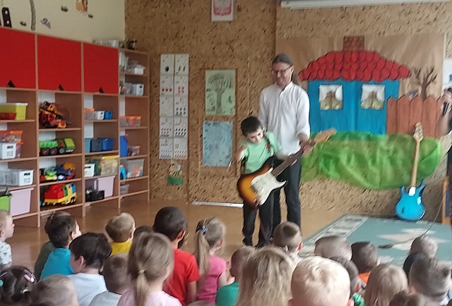 W naszym przedszkolu odbyło się już ostatnie przedwakacyjne muzyczne spotkanie. Dzieci miały okazję poznać różne instrumenty, w tym gitarę klasyczną i elektryczną. Aktywnie uczestniczyły w koncercie poprzez śpiew, taniec oraz próby gry na instrumentach.