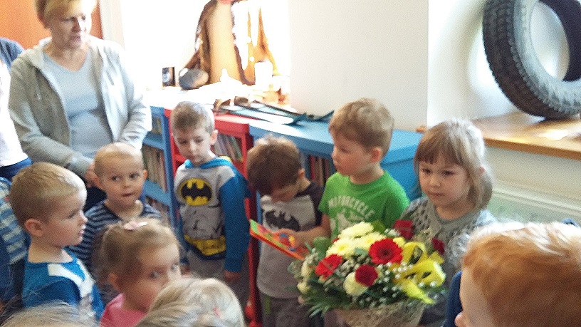 Na zakończenie przedszkolaki wręczyły kwiaty i złożyły życzenia z okazji Dnia Bibliotekarza.