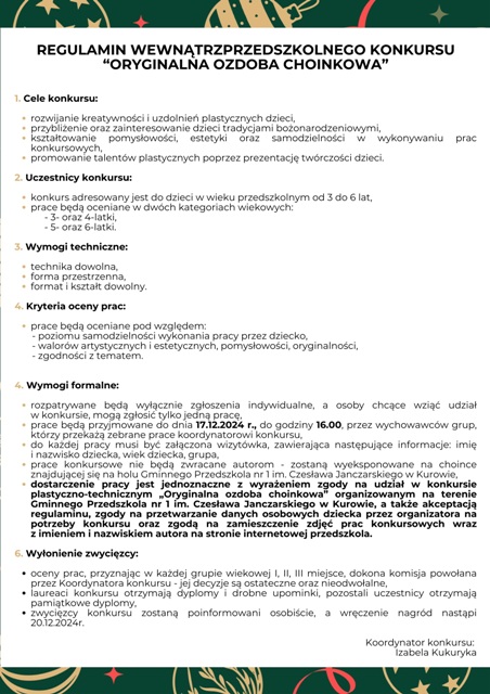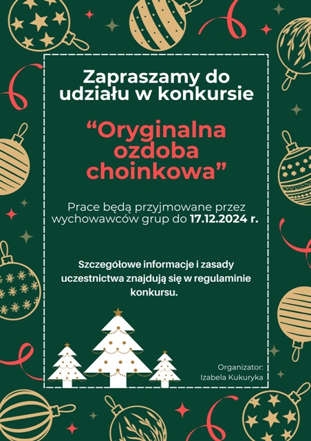 KONKURS "ORYGINALNA OZDOBA CHOINKOWA"Opublikowano: 10 grudzień 2024 | I.K. | Drukuj | Odsłony: 346Serdecznie zapraszamy do udziału w konkursie "Oryginalna ozdoba choinkowa". Wszelkie informacje znajdują się na plakacie oraz w regulaminie konkursu. Poprzedni artykuł Następny artykuł