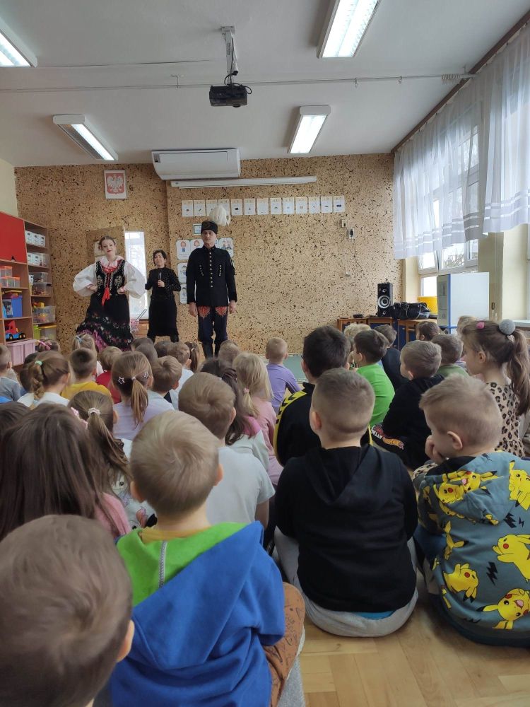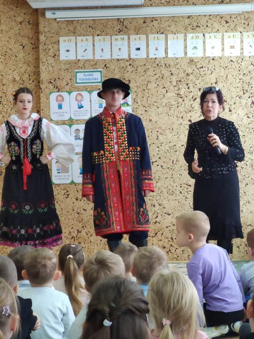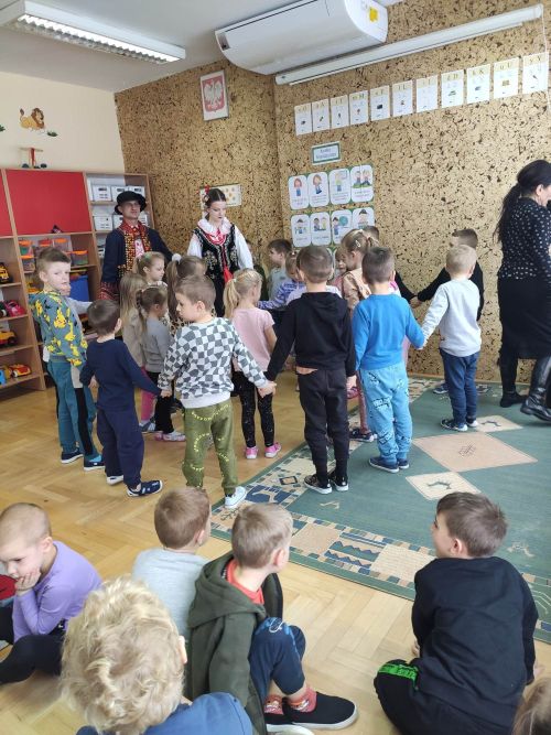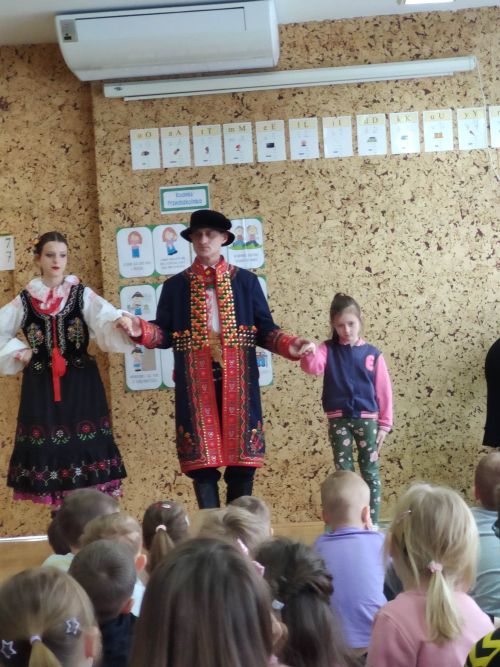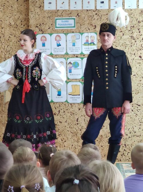 Podczas dzisiejszego spotkania, dzieci poznały strój ludowy górników z okolic Nowego Sącza. Przedszkolaki wspólnie z gośćmi odtańczyły znane polskie tańce: trojaka i krakowiaka.