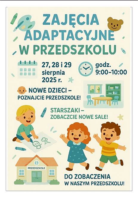 Serdecznie zapraszamy wszystkie dzieci nowo przyjęte do przedszkola na zajęcia adaptacyjne, które odbędą się w naszym przedszkolu w dniach: