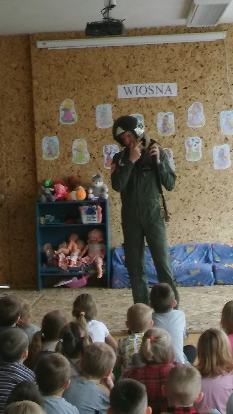 W dniu 14 kwietnia do naszego przedszkola przybyli wspaniali goście - piloci z Jednostki Wojskowej w Dęblinie. Bardzo interesujaco opowiadali o swojej pracy, zaprezentowali dzieciom sprzęt, którym posługują się piloci. Przedszkolaki miały mnóstwo pytań dotyczących pracy pilota oraz samolotów.