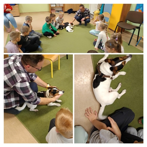 Dzieci z grupy VIII miały wspaniałą okazję gościć w przedszkolu psa - Jokera. Właściciel psa - Tata Neli, opowiedział jak należy zajmować się czworonożnym przyjacielem oraz jakich zasad przestrzegać podczas zabawy z nim. Dzieci dowiedziały się o czym należy pamiętać idąc z psem na spacer oraz jak prawidłowo go głaskać i karmić. Wspólne, edukacyjne spotkanie wywołało wiele pozytywnych emocji, a kontakt z tym wspaniałym czworonogiem był niezwykłym wydarzeniem.